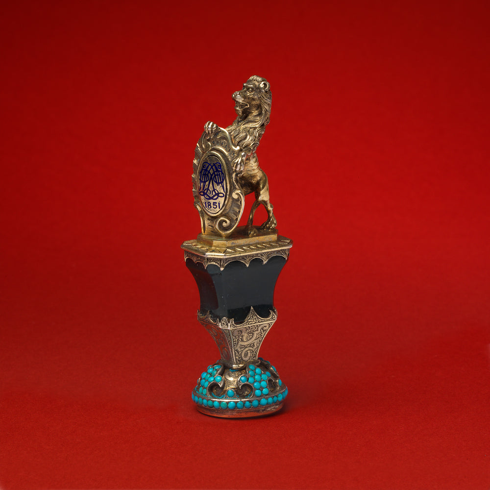 The prancing lion holding a cartouche with enamelled monogram WL over 1851, above a curved tapering bloodstone column, ornate collar, to a domed foot set with turquoise cabochons in fleur-de-lys motifs, the agate matrix, of oval outline, engraved with coat of arms, engraved to the border ‘SIGILLUM